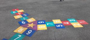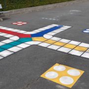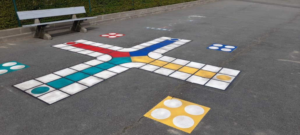 Le 1er pour les maternelles, une triple marelle et le 2nd dans la cour de récréation des élèves de primaire, le jeu des petits chevaux, où dans ce classique, les enfants remplacent les chevaux. Des marquages au sol très colorés et ludiques !